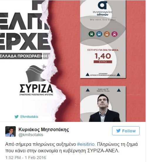 Το μήνυμά του συνοδεύει μια εικόνα, όπου διακρίνει κανείς δύο εισιτήρια: το ένα με την αυξημένη τιμή κομίστρου και το άλλο με τη φωτογραφία του Αλέξη Τσίπρα.