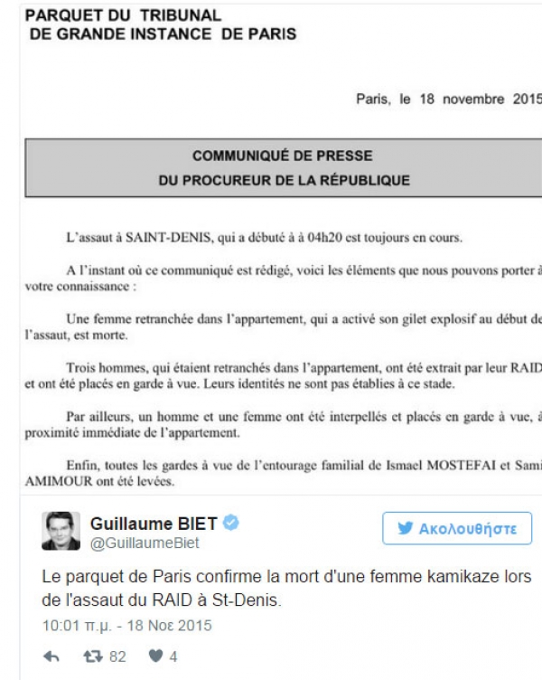 Τρεις από τους οχυρωμένους στο διαμέρισμα του Σεν Ντενί συνελήφθησαν, δύο τρομοκράτες σκοτώθηκαν, ανάμεσά τους η γυναίκα που ανατινάχθηκε πυροδοτώντας ζώνη με εκρηκτικά, όπως ανακοίνωσε ο γενικός εισαγγελέας.