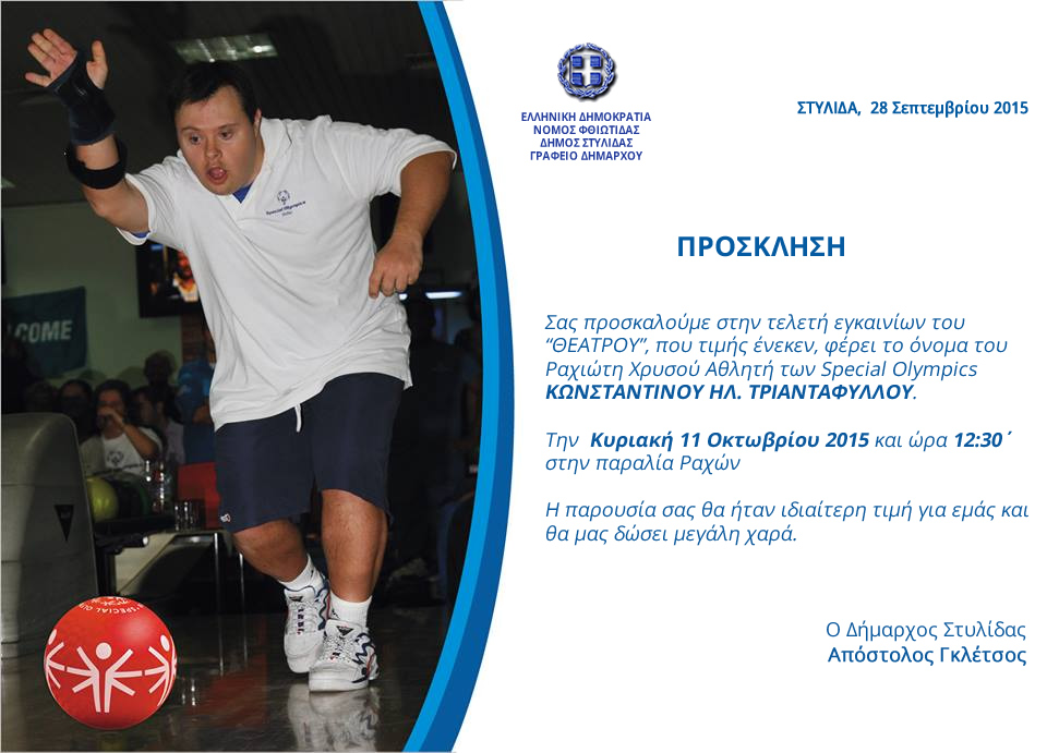 Την ερχόμενη Κυριακή στις 12:30΄ το μεσημέρι ο Δήμος Στυλίδας τιμώντας τον Κωνσταντίνο θα εγκαινιάσει το "Θέατρο" στην παραλία Ραχών που τιμής ένεκεν φέρει το όνομα του Χρυσού Αθλητή των Special Olympics.