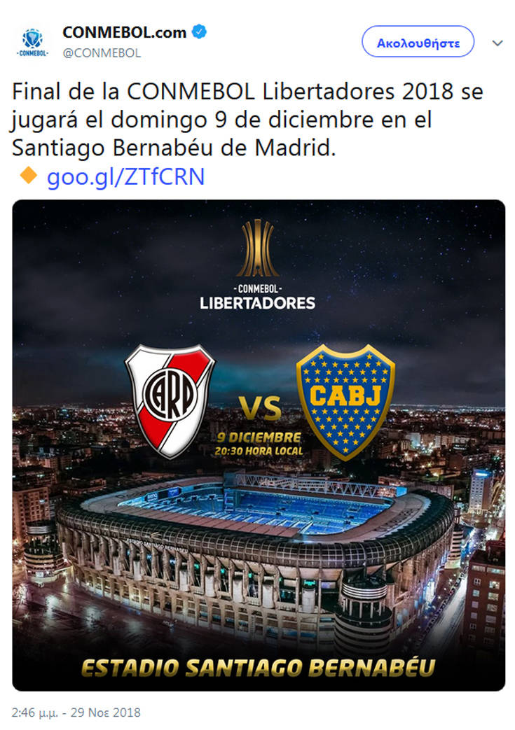 Ο δεύτερος τελικός του Κόπα Λιμπερταδόρες, που ήταν αρχικά να γίνει στο «Μονουμεντάλ», θα διεξαχθεί στη Μαδρίτη και πιο συγκεκριμένα στο «Σαντιάγο Μπερναμπέου». Όπως ανακοίνωσε η CONMEBOL, αυτός θα πραγματοποιηθεί στις 9 Δεκεμβρίου, ημέρα Κυριακή.