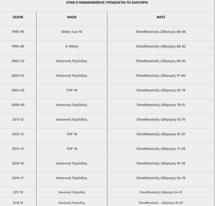 Τα τελευταία 23 χρόνια, δηλαδή από την πρώτη εντός έδρας αναμέτρηση των δύο ομάδων μέχρι και σήμερα, το «τριφύλλι» μετρούσε 12 νίκες σε 12 αγώνες! Ο Παναθηναϊκός δεν είχε χάσει ποτέ από τη Ζάλγκιρις στην Αθήνα, είτε την υποδέχθηκε στο ΟΑΚΑ, είτε και στο κλειστό του Σπόρτιγκ στα μέσα της περασμένης δεκαετίας.
