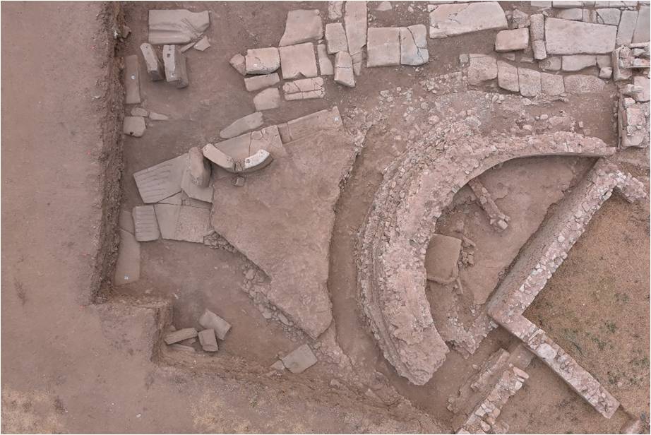 Επανατοποθετημένα μαρμάρινα μέλη μαζί με το κατά χώραν μαρμάρινο μέλος του κρηναίου οικοδομήματος