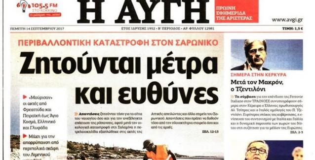 Ακόμα και η «Αυγή» η κομματική εφημερίδα του ΣΥΡΙΖΑ ασκεί κριτική στους χειρισμούς της κυβέρνησης και ειδικότερα των συναρμόδιων υπουργείων για την καταστροφή του Σαρωνικού από την πετρελαιοκηλίδα που ξεκίνησε από τη Σαλαμίνα και έφτασε μέχρι και τη Γλυφάδα.