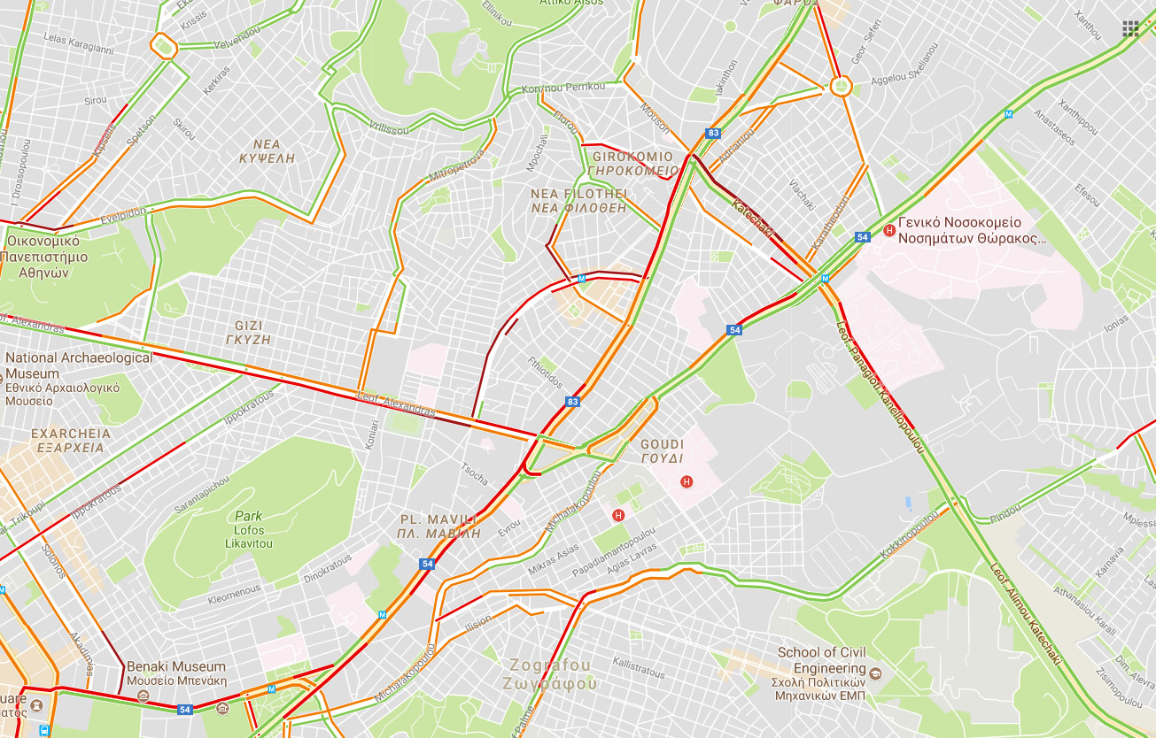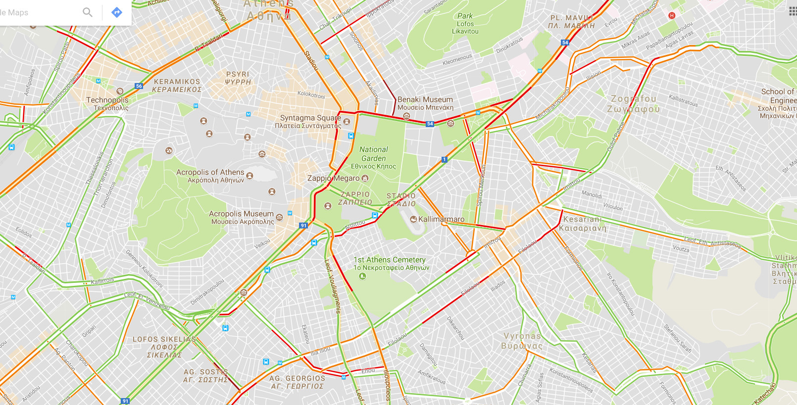 Οπως φαίνεται και απ το χάρτη της Google Maps για την κίνηση, στις 11:50 η κίνηση ήταν αυξημένη στην κάθοδο της Φιλολάου, στην άνοδο της Αρδηττού από την έξοδο της Βουλιαγμένης ως το Παναθηναϊκό Στάδιο, στην άνοδο της Βασιλίσσης Σοφίας στο ύψος του Χίλτον και στην πλατεία Μαβίλη, στην άνοδο της Αμαλίας, στην κάθοδο της Βασιλίσσης Σοφίας, αλλά και στην κάθοδο από την Αλεξάνδρας ως το Ιπποκράτειο (με κόκκινο χρώμα οι δρόμοι στους οποίους η κίνηση είναι αυξημένη).