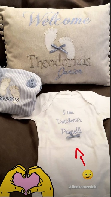 Λίγο πριν το Πάσχα μάλιστα, πήρε ένα καινούργιο δώρο που την έκανε να χαρεί πολύ. Πρόκειται για ένα μαξιλαράκι που γράφει Thodoridis Junior, αλλά και ένα λευκό φορμάκι που έχει γραμμένη πάνω τη φράση “I’m Dutchess’s Prince” ( Είμαι ο πρίγκιπας της Δούκισσας).