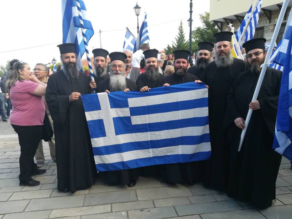 Το συλλαλητήριο που άνοιξε με την πατριωτική και φλογερή ομιλία του ο Σεβασμιώτατος Μητροπολίτης Γρεβενών κ. Δαβίδ, έκλεισε ψάλλοντας όλοι μαζί τον Εθνικό μας Ύμνο και το «Τῇ Ὑπερμάχῳ Στρατηγῷ».