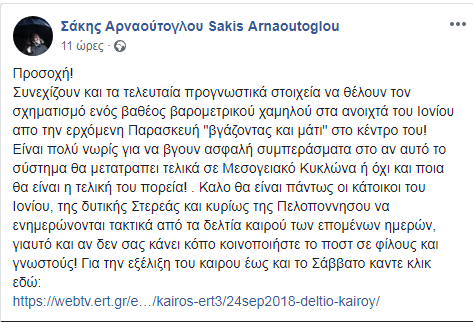 Νωρίτερα ο Σάκης Αρναούτογλου είχε αναφέρει: «Βαρομετρικό χαμηλό με... μάτι ανοιχτά του Ιονίου θέλουν κάποια προγνωστικά μοντέλα την ερχόμενη Παρασκευή - Σάββατο. Θα το παρακολουθούμε καθημερινά τις επόμενες ημέρες και μέσα από τα δελτία καιρού της ΕΡΤ! Προσοχή στους σφοδρούς ανέμους απόψε την νύχτα στη Θεσσαλονίκη και την Τρίτη, Τετάρτη και Πέμπτη στις περισσότερες περιοχές της χώρας σε ξηρά και θάλασσα».