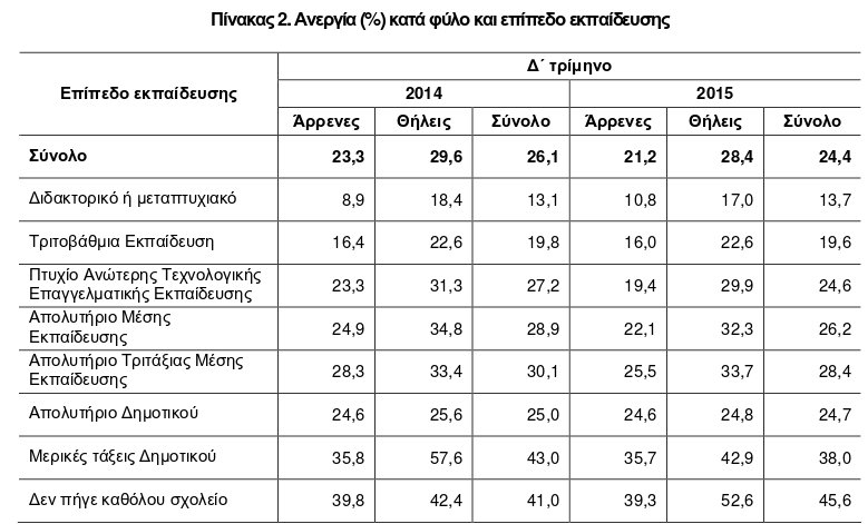 Αυξηση του ποσοστού της ανεργίας σημειώθηκε το τέταρτο τρίμηνο του 2015 και όπως προκύπτει από την ανάλυση των στοιχείων , οι γυναίκες και όσοι δεν έχουν πάει στο σχολείο βιώνουν τα μεγαλύτερα ποσοστά ανεργίας.
