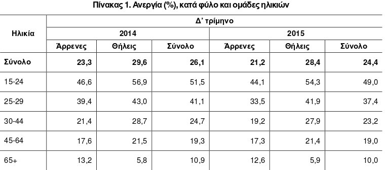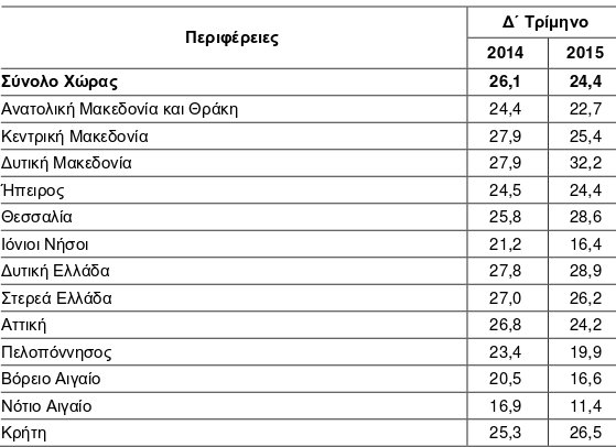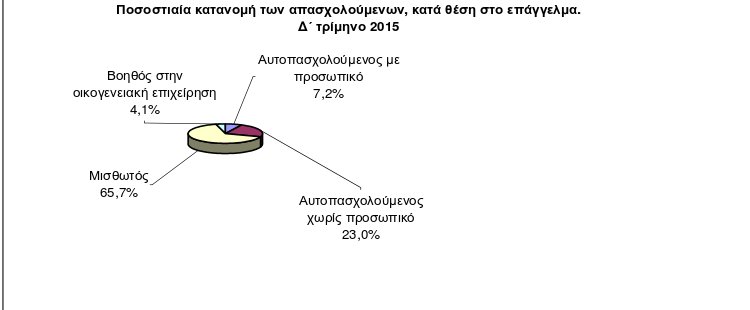 Κατά το Δ΄ Τρίμηνο του 2015 ο αριθμός των απασχολούμενων ανήλθε σε 3.641.682 άτομα και των ανέργων σε 1.174.658, σύμφωνα με τα στοιχεία που ανακοίνωσε η Ελληνική Στατιστική Αρχή. Το ποσοστό ανεργίας ήταν 24,4%, έναντι 24,0% του προηγούμενου τριμήνου και 26,1% του αντίστοιχου τριμήνου 2014.