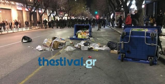 Οι κουκουλοφόροι αναποδογύρισαν κάδους και πέταξαν πέτρες και αντικείμενα προς τους αστυνομικούς οι οποίοι τους απώθησαν.