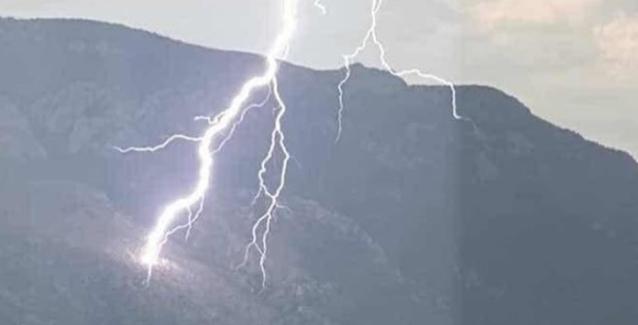 Η φωτογραφία αποτυπώνει τη δύναμη της καταιγίδας, με έναν εντυπωσιακό κεραυνό να «σκίζει» τον ουρανό και να καταλήγει στις πλαγιές απέναντι από τη θάλασσα.