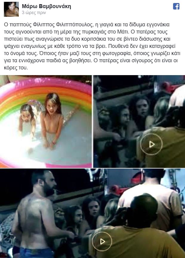 Την ίδια ώρα ο πατέρας Γιάννης Φιλιππόπουλος αναζητά εναγωνίως τις δύο 9χρονες δίδυμες κόρες του, οι οποίες όταν ξέσπασε η πυρκαγιά βρίσκονταν με τη γιαγιά και τον παππού τους.