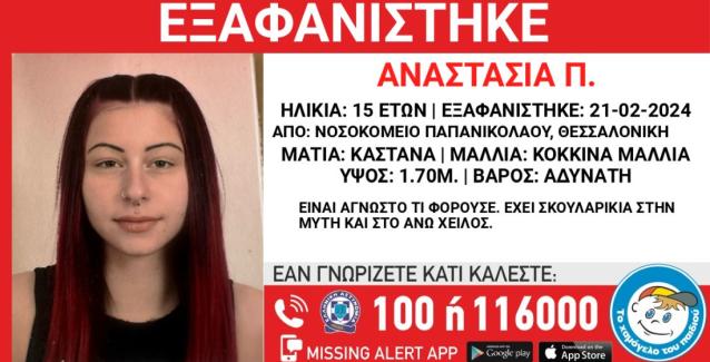 Η 15χρονη έχει κόκκινα μαλλιά, ύψος 1,70 μ. και δεν είναι γνωστό τι φορούσε τη μέρα που χάθηκε.
