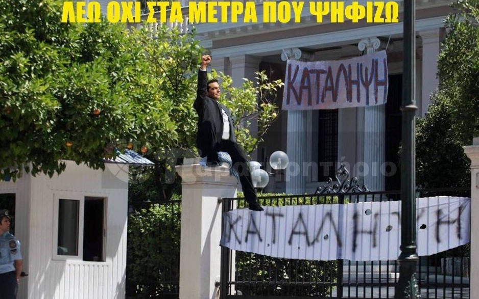 Η χιουμοριστική φωτογραφία δείχνει τον Αλέξη Τσίπρα να κάνει... κατάληψη στο Μαξίμου και να διαμαρτύρεται στα κάγκελα για τα μέτρα που ο ίδιος υπέγραψε.