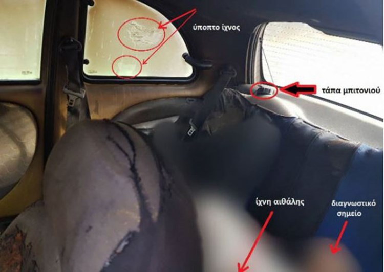 Από την πλευρά του ο δικηγόρος της οικογένειας, Βασίλης Ταουξής, ο οποίος ισχυρίστηκε ότι το αποτύπωμα αυτό αποκαλύπτει την απέλπιδα προσπάθεια της γυναίκας να βγει από το φλεγόμενο αυτοκίνητο.