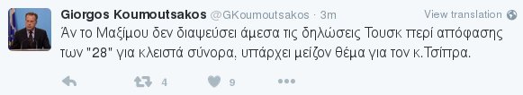 Ο εκπρόσωπος Τύπου της Νέας Δημοκρατίας έγραψε στον προσωπικό του λογαριασμό στο Twitter πως : "Αν το Μαξίμου δεν διαψεύσει άμεσα τις δηλώσεις Τουσκ περί απόφασης των "28" για κλειστά σύνορα, υπάρχει μείζον θέμα για τον κ.Τσίπρα".