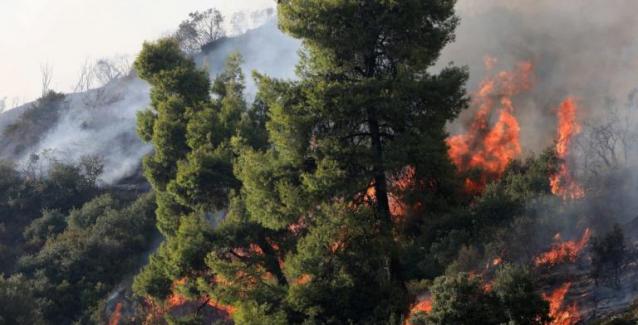 Οι άνεμοι στην περιοχή πνέουν θυελλώδεις και σύμφωνα με πληροφορίες η φωτιά κινείται προς τα παλιά Καλυβάκια.