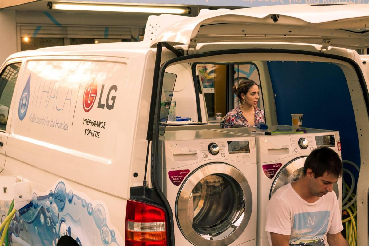 Ένα κινητό πλυντήριο ρούχων ταξιδεύει σε διάφορα σημεία της Αττικής για να ενισχύσει την αξιοπρέπεια και τον αυτοσεβασμό των αστέγων. Φροντίζουν για τη διατήρηση της υγιεινής τους, πλένοντας ανά τακτά χρονικά διαστήματα τα ρούχα τους.