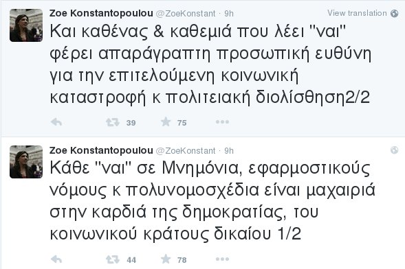 «Κάθε "ναι" σε Μνημόνια, εφαρμοστικούς νόμους και πολυνομοσχέδια είναι μαχαιριά στην καρδιά της δημοκρατίας, του κοινωνικού κράτους δικαίου», έγραψε η κ. Κωνσταντοπούλου στο λογαριασμό της στο Twitter, ενώ συμπλήρωσε με νέα ανάρτηση, γράφοντας «Και καθένας και καθεμιά που λέει "ναι" φέρει απαράγραπτη προσωπική ευθύνη για την επιτελούμενη κοινωνική καταστροφή και πολιτειακή διολίσθηση».