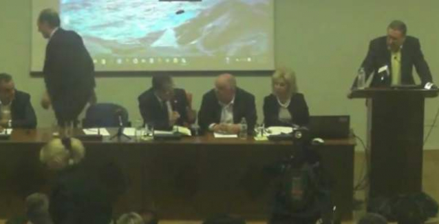 Δριμύ κατηγορώ κατά του Υπουργού Ενέργειας και Περιβάλλοντος εξαπέλυσε ο επικεφαλής της μείζονος αντιπολίτευσης Γιώργος Δακής. Μάλιστα ο κ. Δακής, αφού πρωτίστως κατηγόρησε τον κ. Σταθάκη πως υπέγραψε το Φ.Ε.Κ. για την πώληση του 17% των μετοχών της Δ.Ε.Η., δεν δίστασε να χαρακτηρίσει ως «σαρδόνιο» το χαμόγελο του Υπουργού προκαλώντας μικροένταση στη συνεδρίαση, σημείο, όπου, ο Περιφερειάρχης και ο Πρόεδρος του Περιφερειακού Συμβουλίου του ζήτησαν να ρίξει τους τόνους και να αποτραπούν οι προσωπικοί χαρακτηρισμοί τόσο από τον ίδιο όσο και από το κοινό.