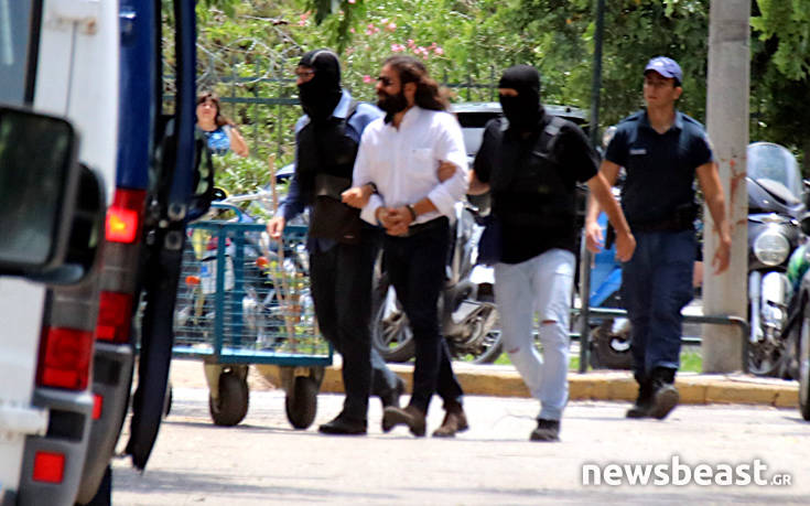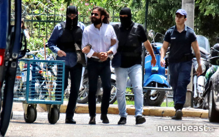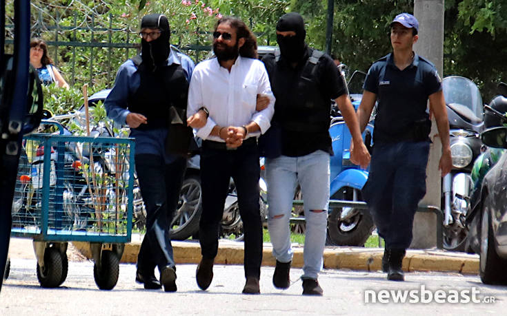 Ο Κώστας Μπαρμπαρούσης βγήκε χαμογελαστός και με χειροπέδες από τον ανακριτή καθώς θα μεταφερθεί εκ νέου στον εισαγγελέα.