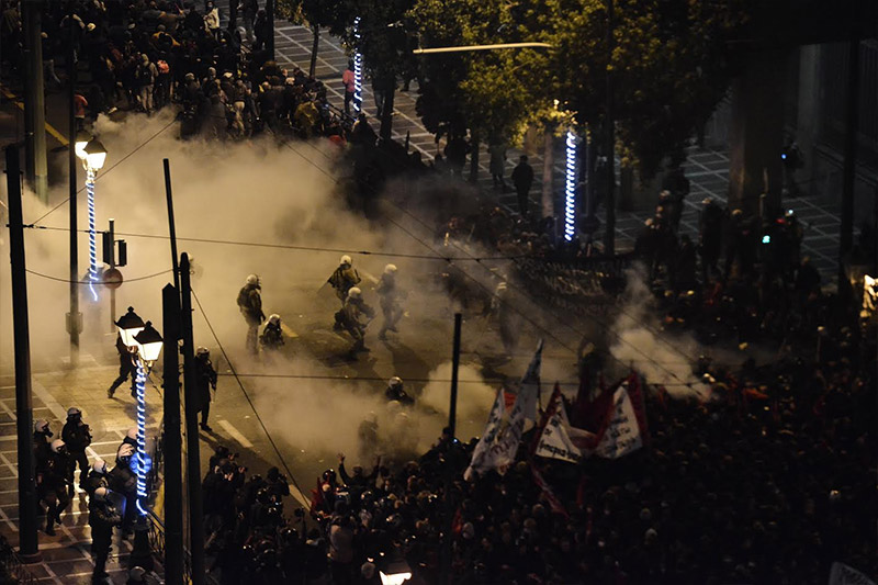 Η αστυνομία απάντησε με την εκτόξευση δακρυγόνων και χημικών, ενώ οι αντιεξουσιαστές είχαν συγκεντρωθεί στον πεζόδρομο της Τοσίτσας και εκτόξευαν βόμβες μολότοφ και άλλα αντικείμενα.