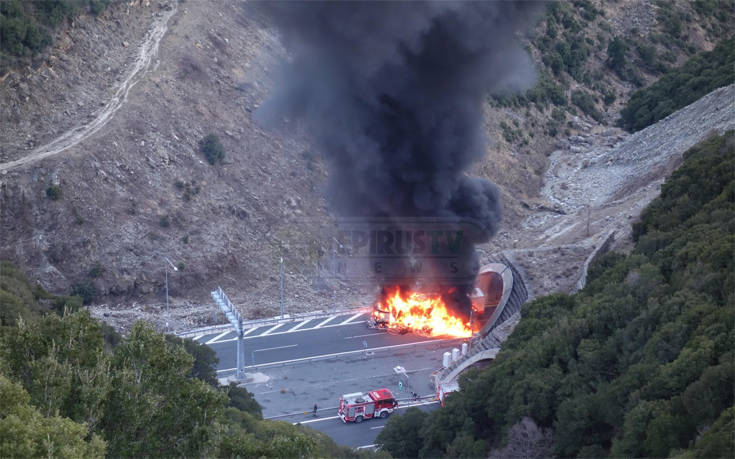 Νταλίκα που κινούταν στην Εγνατία οδό στο ρεύμα κυκλοφορίας προς Θεσσαλονίκη, τυλίχθηκε στις φλόγες, για άγνωστη μέχρι στιγμής αιτία, στο ύψος της μεγάλης σήραγγας Μετσόβου.