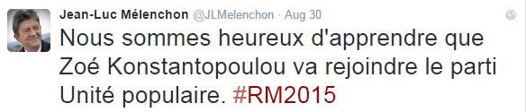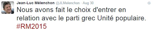 Μέσω Twitter, o κ. Μελανσόν έγραψε την Κυριακή ότι «επιλέξαμε να ανοίξουμε συνεργασία με το ελληνικό κόμμα Λαϊκή Ενότητα».