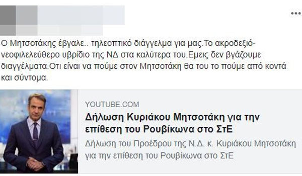 Ηγετικό στέλεχος της αναρχικής ομάδας στην προσωπική του σελίδα στο Facebook αναφέρει χαρακτηριστικά: «Ο Μητσοτάκης έβγαλε τηλεοπτικό διάγγελμα για μας. Το ακροδεξιό νεοφιλελεύθερο υβρίδιο της Νέας Δημοκρατίας στα καλύτερά του. Εμείς δεν βγάζουμε διαγγέλματα. Ότι είναι να πούμε στον Μητσοτάκη, θα του το πούμε από κοντά και σύντομα».