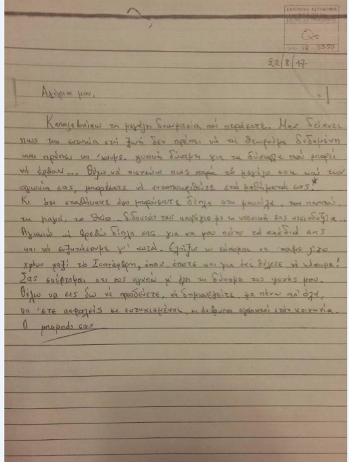 Πειστήρια θα πάρετε ακόμα μια φορά μόνο. Οι άνθρωποι που είναι εδώ που με κρατάνε, μου φέρονται καλά. Μη γίνει κάποιο λάθος παρακαλώ.