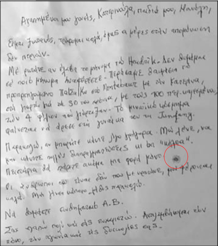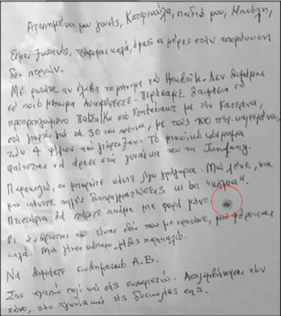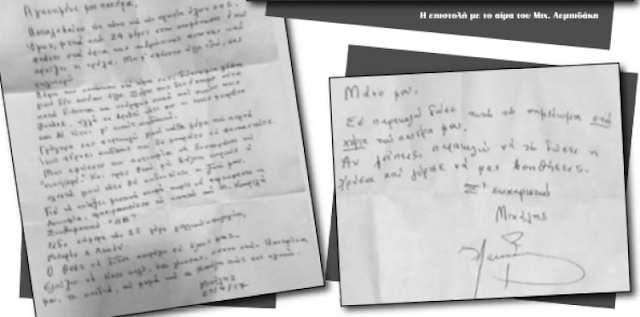 Οι επιστολές που δημοσιεύει η εφημερίδα «Πατρίς», βρίσκονται στη Διεύθυνση Εγκληματολογικών Ερευνών, γράφτηκαν από τον ίδιο (αναγνωρίστηκε ο γραφικός του χαρακτήρας από την πρώτη στιγμή) και σφραγίστηκαν με το… αίμα του!