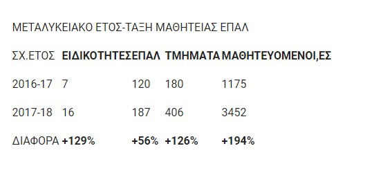 Β. Στον αριθμό των Επαγγελματικών Λυκείων στα οποία λειτουργούν τμήματα μαθητείας, από 120 το σχολ. έτος 2016-17, σε 187 το σχολ. έτος 2017-18.