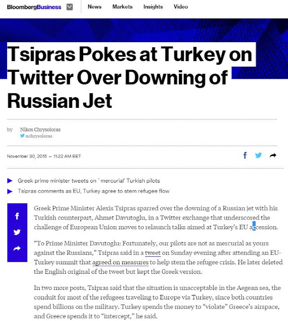«Ο Ελληνας πρωθυπουργός προχώρησε σε λογομαχία μέσω Twitter με τον Τούρκο ομόλογό του, σε μια κίνηση που υπονόμευσε τις προσπάθειες της ΕΕ να επανεκκινήσει τις ενταξιακές διαπραγματεύσεις με την Τουρκία», σημειώνει το πρακτορείο ειδήσεων Bloomberg και συνεχίζει: «Η λογομαχία απείλησε να να υποβαθμίσει τα αποτελέσματα της συνόδου κορυφής». Bloomberg: Ο Τσίπρας «πειράζει» την Τουρκία στο Twitter για την κατάρριψη του ρωσικού τζετ «Ο Αλέξης Τσίπρας έκανε την ασυνήθιστη κίνηση να χρησιμοποιήσει τα κοινωνικά δίκτυα για να ασκήσει κριτική στον Αχμέτ Νταβούτογλου για τις ενέργειες της αεροπορίας της Τουρκίας, πριν σβήσει τα tweets του», σχολιάζει η αγγλική εφημερίδα The Guardian.
