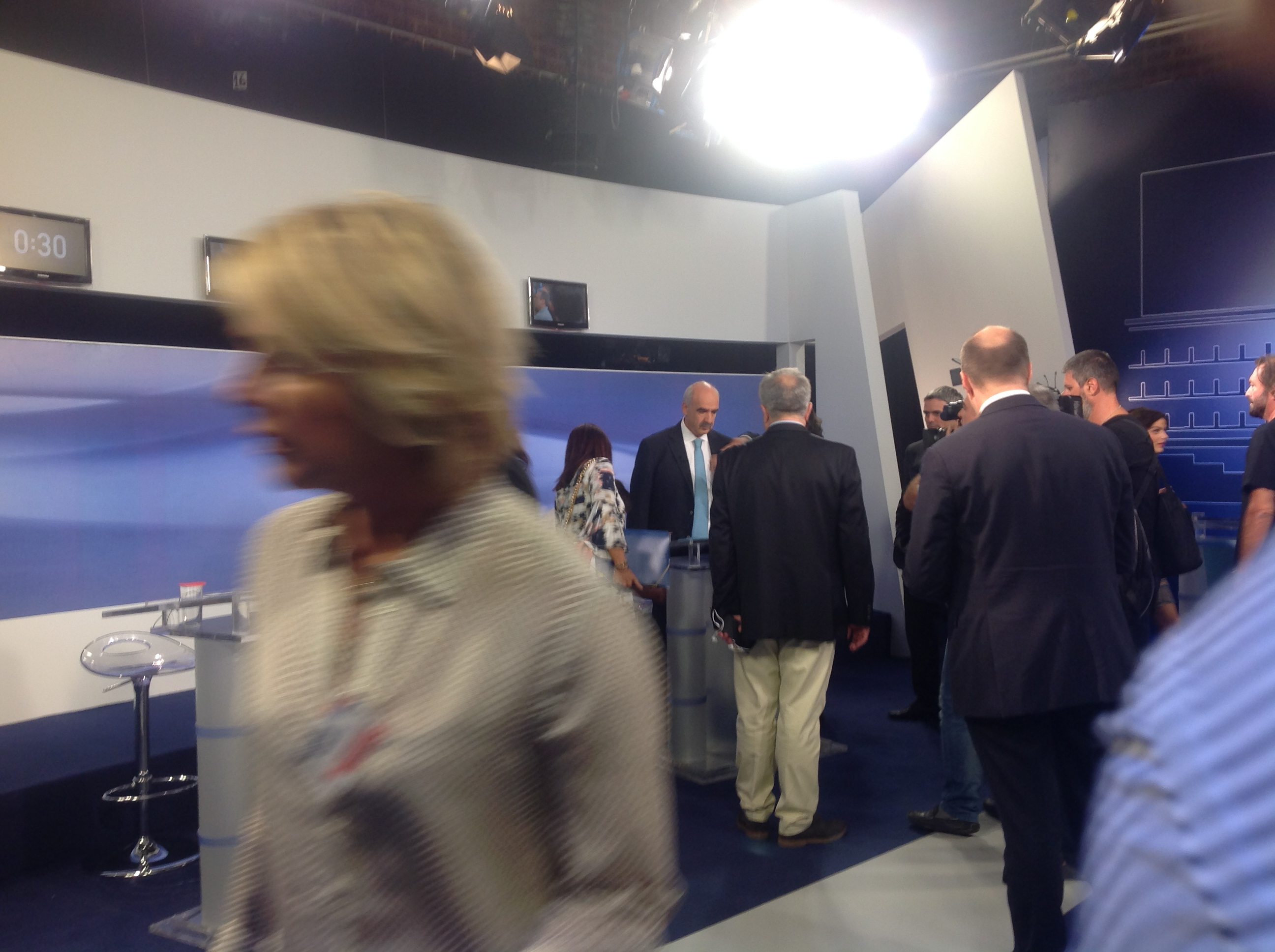 Οι δύο πολιτικοί αρχηγοί, κατευθύνθηκαν στο στούντιο της ΕΡΤ και πήραν τις θέσεις τους. Χαιρέτησαν τους δημοσιογράφους που είχαν στηθεί απέναντί τους και δέχθηκαν τις περιποιήσεις των μακιγιέζ.