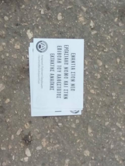 Μοιράστηκαν, επίσης, κείμενα της Αναρχικής Πολιτικής Οργάνωσης στους περαστικούς που αναφέρονται στον αγώνα που διεξάγεται τους τελευταίους μήνες στην Γαλλία ενάντια στον νέο εργασιακό νόμο και στο Καθεστώς Έκτακτης Ανάγκης, πετάχτηκαν τρικάκια και στάλθηκαν φαξ κοινοποίησης της κατάληψης και αλληλεγγύης σε όσους αγωνίζονται στη Γαλλία (σε ελληνικά και γαλλικά) σε πρεσβείες και υπουργεία.
