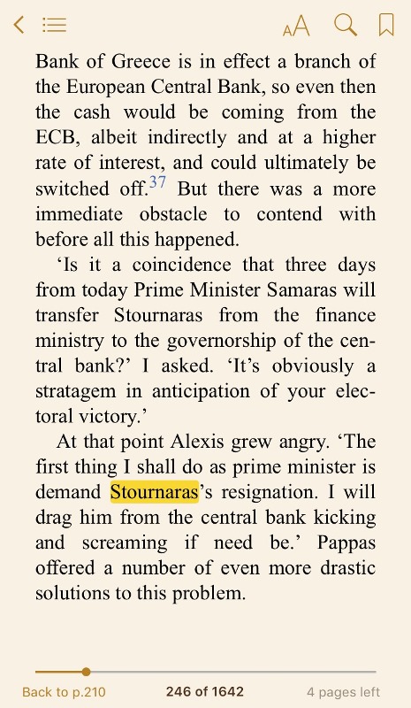 Στο εν λόγω βιβλίο, το πλέον πολυσυζητημένο του πρώην υπουργού Οικονομικών, Γιάνη Βαρουφάκη, υπάρχει πλήθος αναφορών στον Γιάννη Στουρνάρα, ωστόσο, πράγματι μια συγκεκριμένη ξεχωρίζει αφού δείχνει τις διαθέσεις του Αλέξη Τσίπρα και του Νίκου Παππά όταν έμαθαν πως ο Στουρνάρας θα αναλάβει διοικητής της Τράπεζας της Ελλάδας: