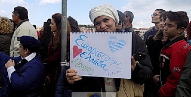 25 Μαρτίου 2016 - 19:44 Τελευταία τροποποίηση στις 25 Μαρτίου, 2016 - 19:45 Ελλάδα Tρεις οικογένειες από τη Σύρια και το Ιράκ παρακολούθησαν μαζί με τα παιδιά τους και μια εθελόντρια την παρέλαση της 25ης Μαρτίου στην Μυτιλήνη... Τα παιδάκια των προσφύγων μάλιστα είχαν φτιάξει πλακάτ «Ευχαριστούμε Ελλάδα», «Λέσβος Σαγαπαμε».