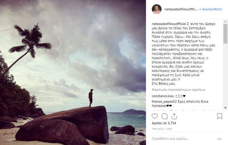 Η Νατάσσα Μποφίλου ανέβασε στο Instagram μία φωτογραφία, προφανώς από κάποιον εξωτικό προορισμό, και τη συνόδευσε με το εξής κείμενο: