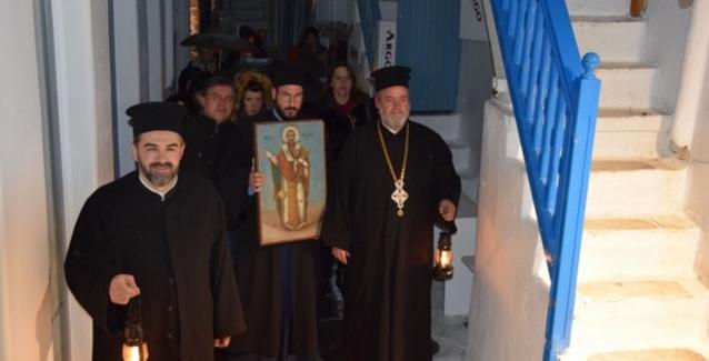 Πραγματοποιήθηκε και φέτος στη Μύκονο το έθιμο με τη λιτάνευση της εικόνας του Μεγάλου Βασιλείου συνοδεία πιστών που κρατούσαν κεριά αναμμένα και φαναράκια.