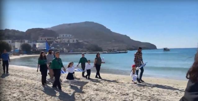 Στο ακριτικό νησί, τα τέσσερα παιδιά κράτησαν μία ελληνική σημαία και συνοδεία εκπαιδευτικών και γονιών που τα κρατούσαν από τα χέρια, παρήλασαν στην αμμουδιά.