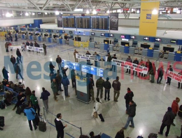 Κατευθύνθηκαν στην αίθουσα αφίξεων από ευρωπαϊκές χώρες και ξεδίπλωσαν πανό στα ελληνικά και στα αγγλικά. «Οχι στον αφανισμό των αγροτών», «Η Ευρώπη είναι ελληνική λέξη» και κρατούν και μια φωτογραφία του Βόλφκαγκ Σόιμπλε με την λεζάντα "this is the voice of Greece stupid".