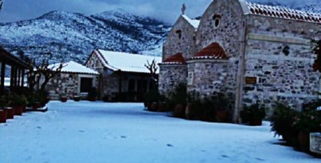 Στα “λευκά” ντύθηκε για άλλη μια χρονιά η Ιερά Μονή της Αγίας Ειρήνης, που βρίσκεται νότια του Κρουσώνα στο Ηράκλειο.