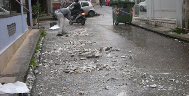 Συγκεκριμένα κομμάτι μπαλκονιού του 1ου ορόφου κατέρρευσε με αποτέλεσμα σοβάδες να πέσουν και στον δρόμο στη συμβολή των οδών Καλοκαιρινού και Αγίου Μηνά. Ευτυχώς εκείνη την ώρα δεν περνούσε από το σημείο πεζός και αποφεύχθηκαν τραυματισμοί.