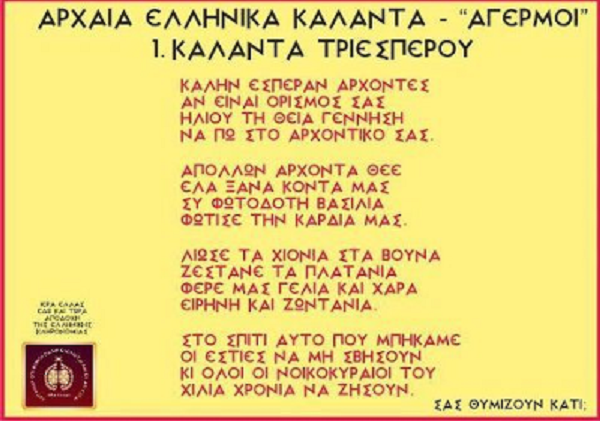 Πίσω από τα κάλαντα κρύβεται ένα αρχαίο Ελληνικό έθιμο με το όνομα Ειρεσιώνη, που αναφέρεται ήδη από τον Όμηρο, ο οποίος ευρισκόμενος στην Σάμο, σκάρωσε διάφορα τραγούδια τα οποία μαζί με μια ομάδα παιδιών τα τραγουδούσαν στα σπίτια των πλουσίων ευχόμενοι πλούτο, χαρά και ειρήνη. Συμβόλιζε την ευφορία και γονιμότητα της γης και εορτάζονταν δυο φορές το χρόνο, μια την άνοιξη με σκοπό την παράκληση των ανθρώπων προς τους θεούς κυρίως του Απόλλωνος-ήλιου και των Ωρών για προστασία της σποράς και μια το φθινόπωρο, για να τους ευχαριστήσουν για την συγκομιδή των καρπών. Ταυτόχρονα με τις ευχαριστίες προς τους θεούς, έδιναν ευχές και στους συνανθρώπους.