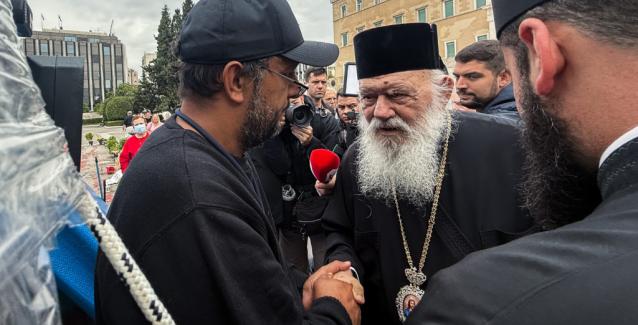 Στο πλευρό του, ως ένδειξη συμπαράστασης στον αγώνα που κάνει, βρέθηκε για πρώτη φορά τη Δευτέρα το πρωί 6 Οκτωβρίου ο αρχιεπίσκοπος Ιερώνυμος. Είχαν μία σύντομη συζήτηση οι δυο τους έξω από τη σκηνή του απεργού πείνας.