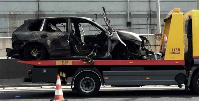 Ξαφνικά, το αυτοκίνητο φαίνεται να παρεκκλίνει της πορείας του με κατεύθυνση προς τα αριστερά. Βρίσκει στο στηθαίο και σέρνεται για περισσότερα από 100 μέτρα. Στη συνέχεια ξεσπά πυρκαγιά.