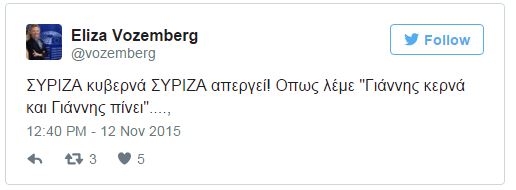 «ΣΥΡΙΖΑ κυβερνά ΣΥΡΙΖΑ απεργεί! Οπως λέμε "Γιάννης κερνά και Γιάννης πίνει"....» σημείωσε χαρακτηριστικά η κα Βόζενμπεργκ.