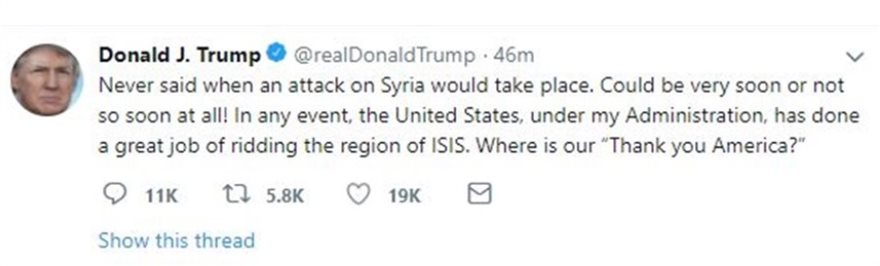 «Ποτέ δεν είπα πότε θα γίνει επίθεση στη Συρία. Μπορεί να γίνει πολύ σύντομα ή όχι και τόσο σύντομα τελικά! Σε κάθε περίπτωση οι ΗΠΑ υπό τη διακυβέρνησή μου έκαναν τεράστια δουλειά ώστε να ξεφορτωθεί η περιοχή τον ISIS. Πού είναι το «Ευχαριστώ Αμερική».