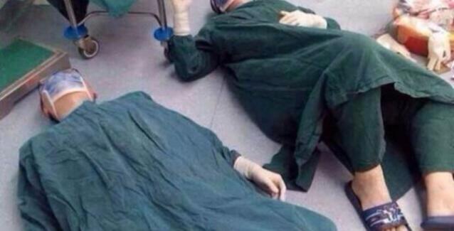Η φωτογραφία δείχνει δύο εξαντλημένους χειρούργους πεσμένους στο πάτωμα, ύστερα από μία επέμβαση που διήρκεσε 32 ώρες.