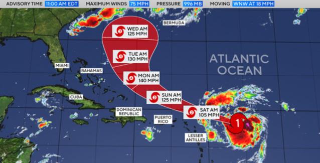 Συνοδευόμενος από ανέμους που πνέουν με ταχύτητα 240 χλμ/ώρα, ο κυκλώνας Έριν κατευθύνεται προς τις Μικρές Αντίλλες, μια περιοχή που περιλαμβάνει τις αμερικανικές και τις βρετανικές Παρθένους Νήσους και το Πουέρτο Ρίκο, αμερικανικό έδαφος που υπέστη σημαντικές καταστροφές από τον κυκλώνα Μαρία τον Σεπτέμβριο του 2017.